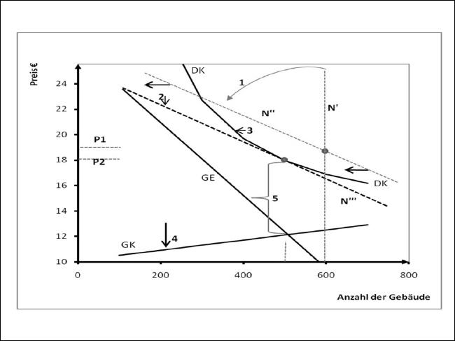 Durch die neue, elastischere Nachfrage ergibt sich zwangsläufig eine andere Gesamtkostenstruktur. Durch die Veränderung der Elastizität sowie der Ausnutzung von Dichtevorteilen, die, wie wir bereits wissen in fallenden Durchschnittskosten resultieren, kommt es zu einer Reduzierung von Fixkosten und variablen Kosten, dies wird durch eine Durchschnittskurve induziert, welcher gegenüber der Ursprungslinie eine fallende Tendenz aufweist. Auf Grund der Betriebsgrößenänderungen (gesunkene Kosten) sowie durch neue Technologien, Anreize zu Kosteneinsparungen, Innovationen usw. verschiebt sich die Linie der bisherigen Durchschnittskosten nach unten (3), und gleichzeitig verschiebt sich die Grenzkostenkurve nach rechts unten (4). |